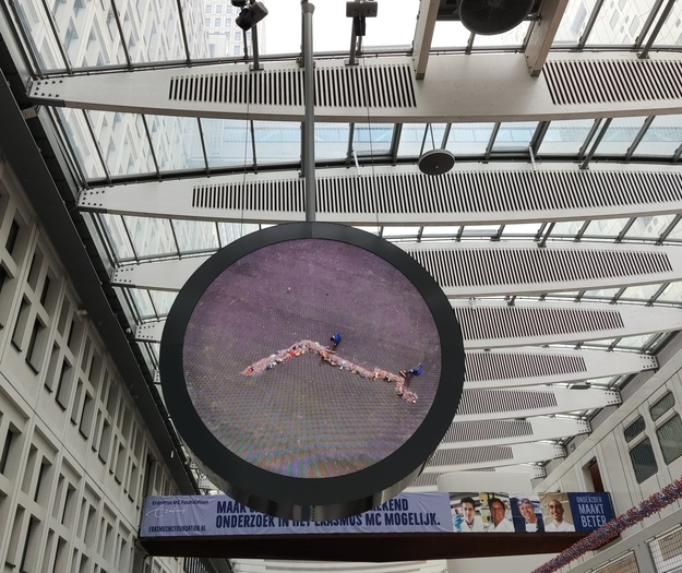 Tegenover me zat een man geruime tijd met gesloten ogen op bank. Blond haar, matje in nek en in wit trainingspak met opdruk. Zat hij te mediteren, of keek hij naar een film tegen de binnenkant van zijn ogen? Stel dat hij niet goed werd, zat-ie op een uitgekiende locatie: longpoli Erasmus.