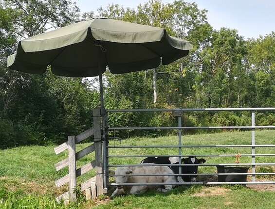 Midden in ons dorp ligt weiland met daarop twee pinken (eenjarige koeien.) Eigenaar heeft voor schaduwplek gezorgd. In speciekuip zit water, maar dieren kunnen ook uit sloot drinken. .